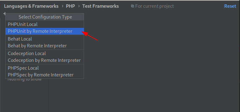 Dentro del árbol de menú de settings de antes, existe un sección para poder configurar el debug de PhpStorm. sólo tenemos que agregar un Debug de Tipo PHPUnit remoto y escoger el servicio web que acabamos de configurar.